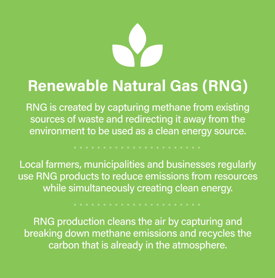 That means it can be added into the natural gas pipeline for use in homes, businesses, factories, and generating electricity. It can even be used as a transportation fuel. RNG is a renewable resource that can be used within our natural gas infrastructure. As we better manage our waste streams from landfills to wastewater, we can create more and more renewable natural gas. That's good because RNG is considered carbon negative. When organic waste decomposes naturally, methane escapes into the atmosphere. By capturing this gas to create renewable fuel, we are reducing greenhouse gas emissions and addressing climate change.